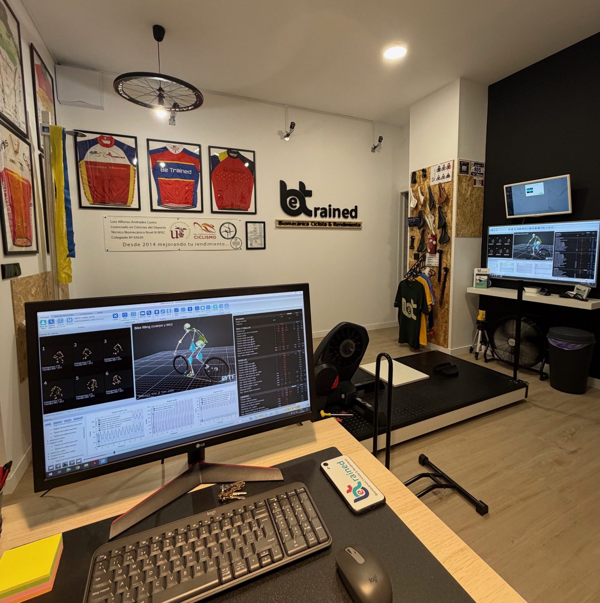 Hemos diseñado este espacio pensando en la comodidad del ciclista durante el Estudio Biomecánico, donde se sienta participe del proceso, con visualización de datos en tiempo real de todas las variables que estamos monitorizando para tomar decisiones en base a los cambios propuestos en su bicicleta y las recomendaciones en el ciclista.
